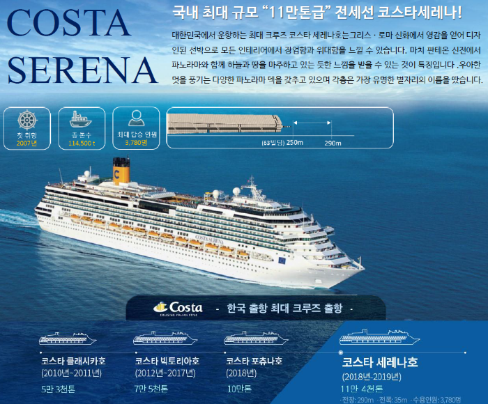 정말 엄청난 규모의 배입니다. 국내에서는 가장큰 규모라고 하고 전세계적으로봐도 10위 이내는 된다고 들었습니다. 배안에는 모든게 있다고 생각하시면 됩니다. 실내, 실외 수영장, 면세점, 카지노, 영화관, 실내댄스장, 야외 특설무대, 키즈카페, 칵테일바, 오락실, 가면무도회, 놀이시설, 스파, 마사지실, 헬스장, 미술관, 박물관 등