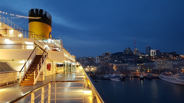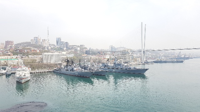 낮동안 러시아 내부 여행을 하고, 저녁때 다시 배로 탑승하여 일본으로 출항 준비를 하고 늦은 시간에 출항을 하였습니다. 많은 군함과 함께 있는 모습이 더욱 이국적이게 느껴졌습니다.